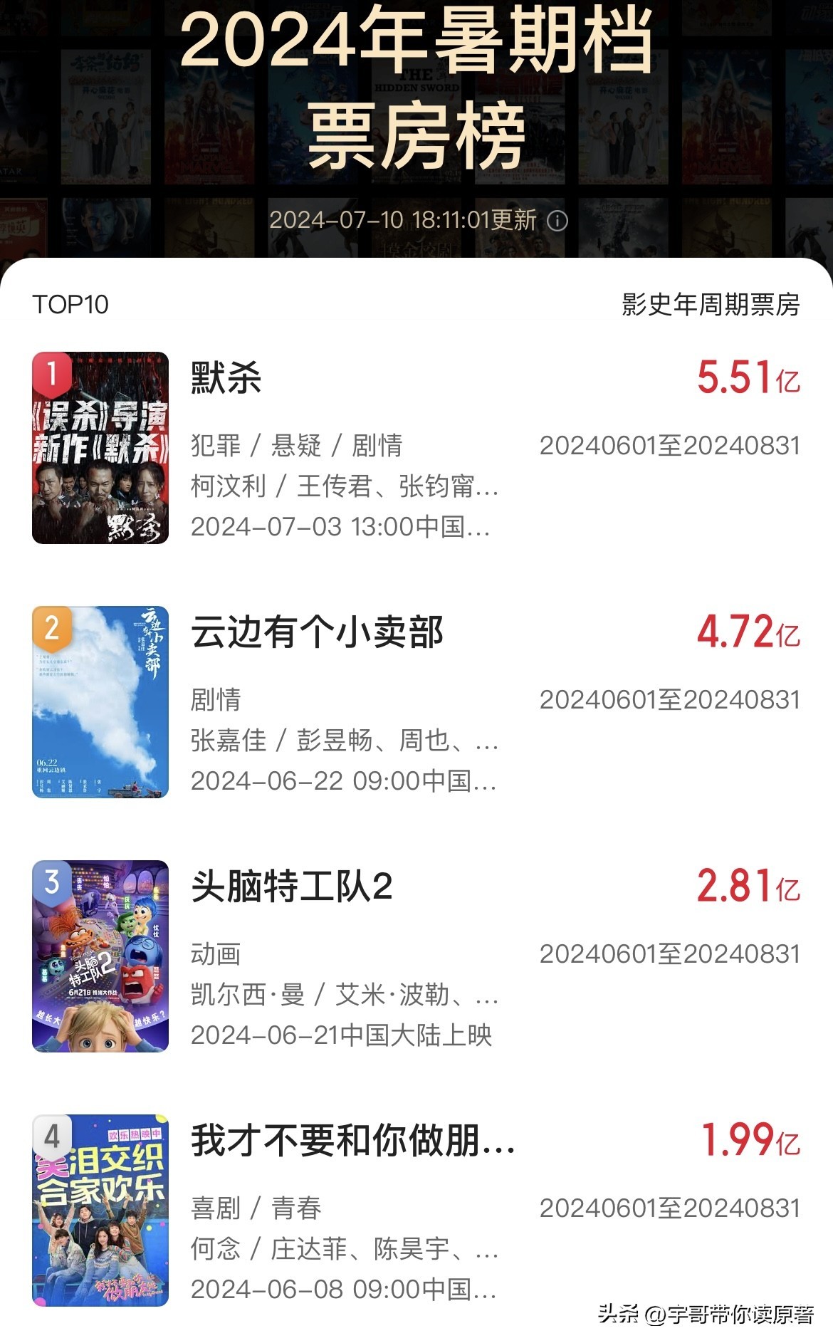 截止到发文,《云边有个小卖部》刚被《默杀》打败,成为了2024年暑期档内地票房榜的第二名。