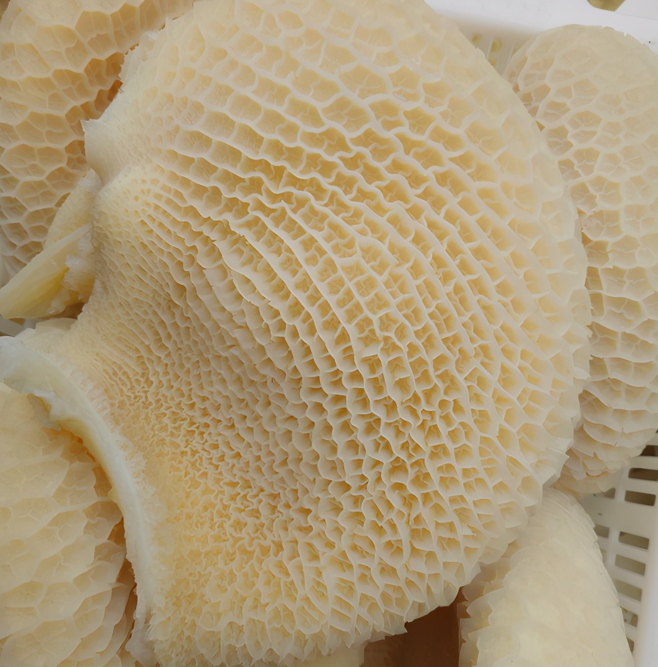 这部分是牛存储反刍饲料的位置。反刍胃的胃壁像蜂巢一样,在里昂附近美食中有道名为“镶牛肚”的菜就是用它做的。