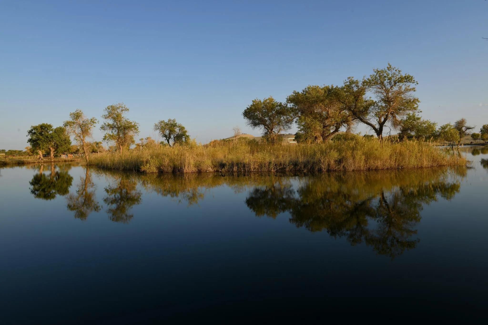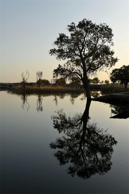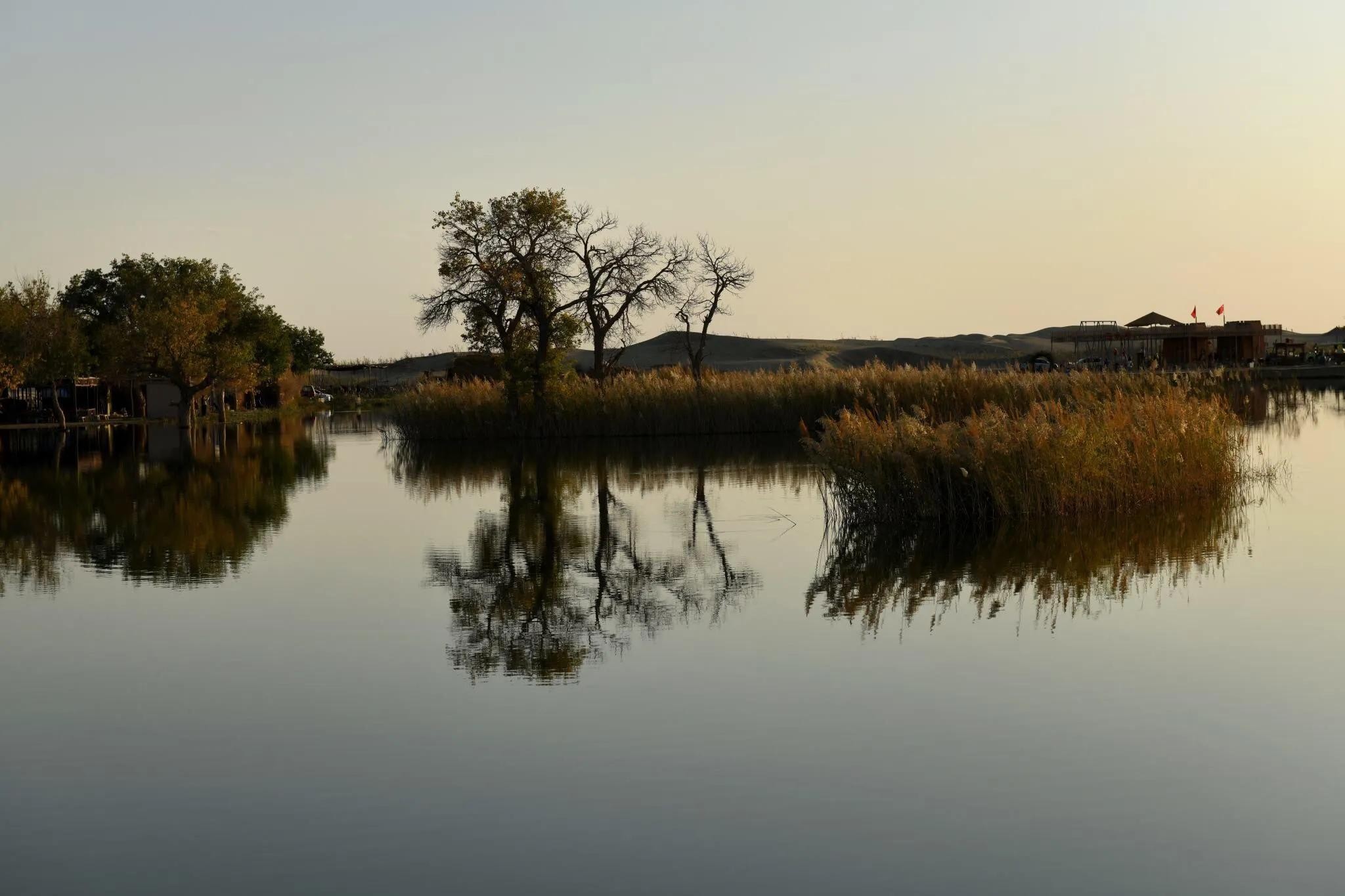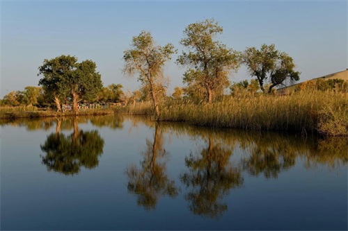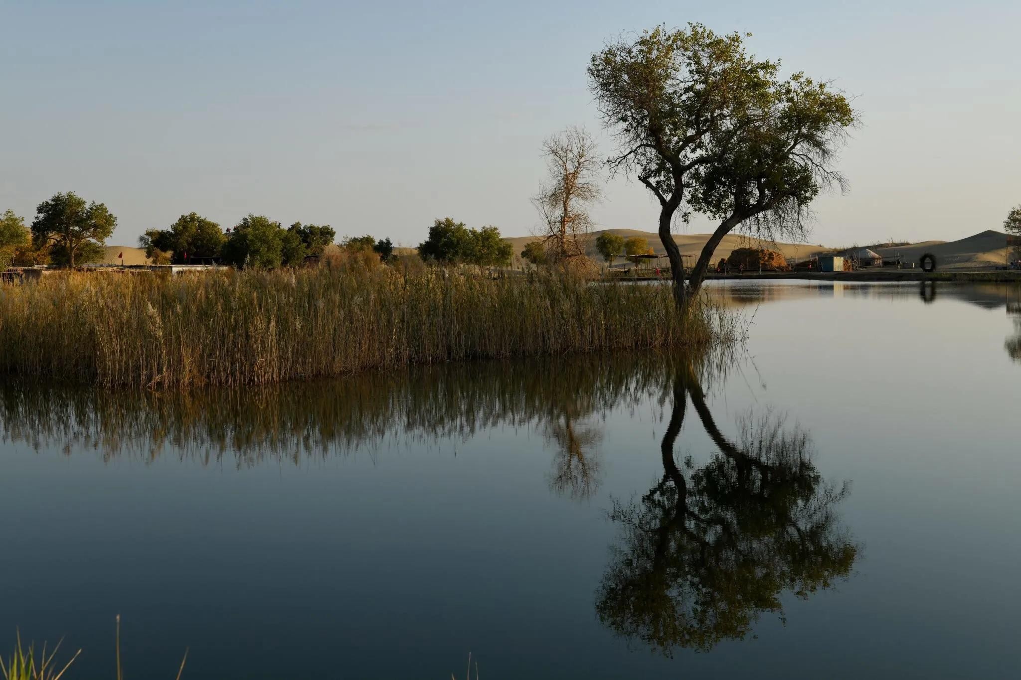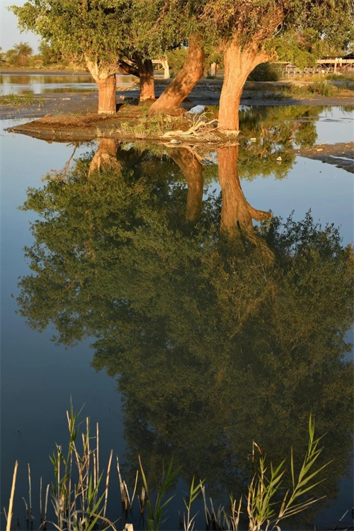 湖岸上、湿地中生长着若干千姿百态的胡杨树。且不仅仅是胡杨,还有沙漠、湖水、河流及浅滩,它们一起构成了罗布人村寨与众不多的胡杨林景观。