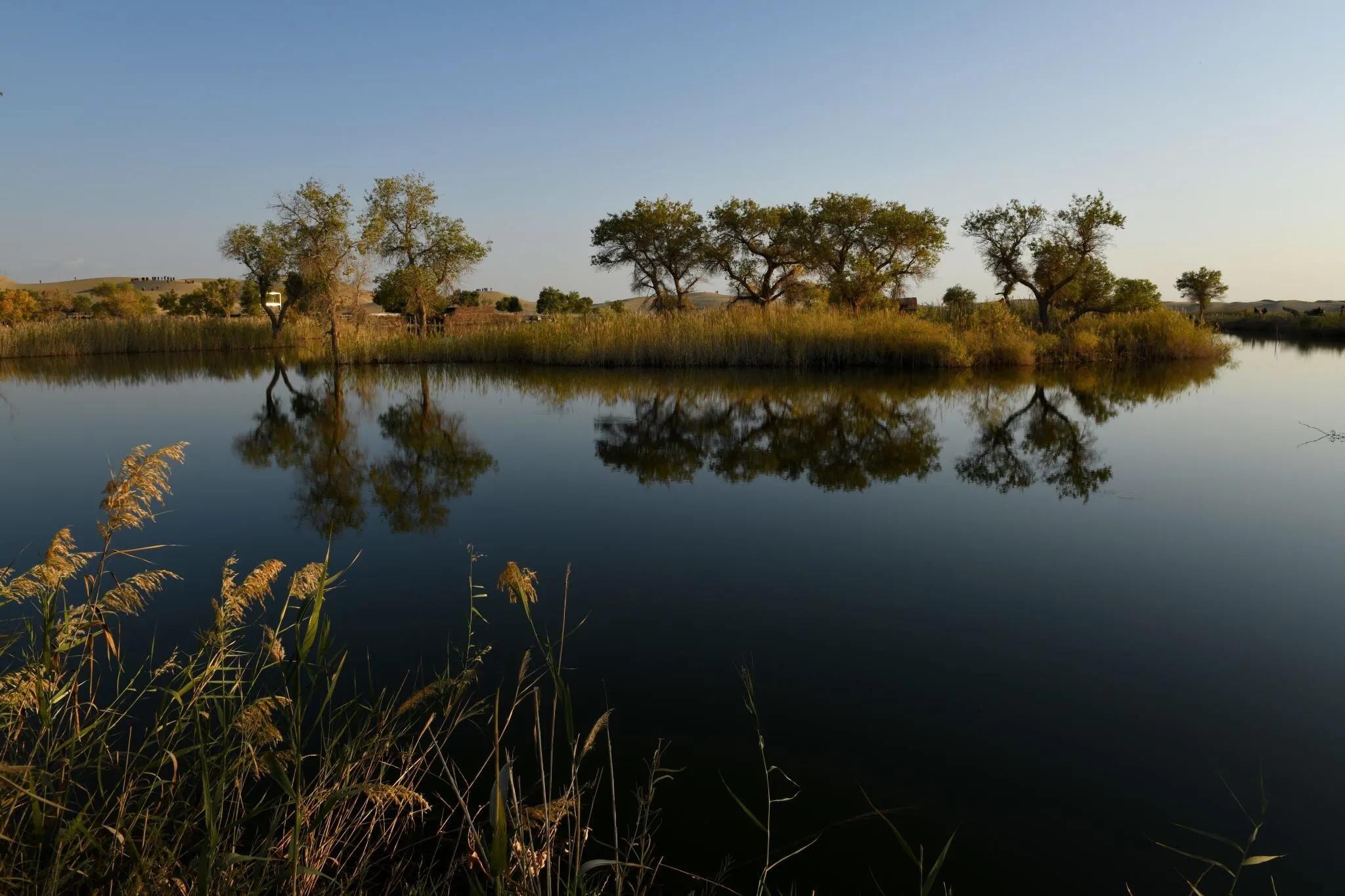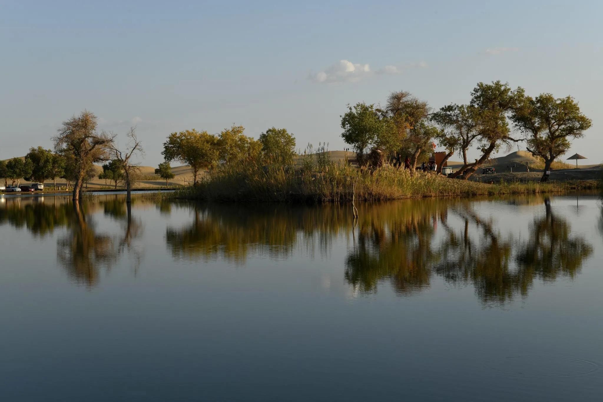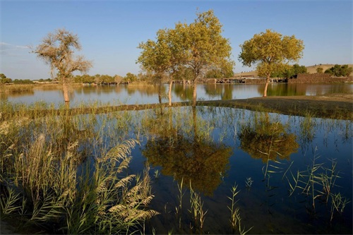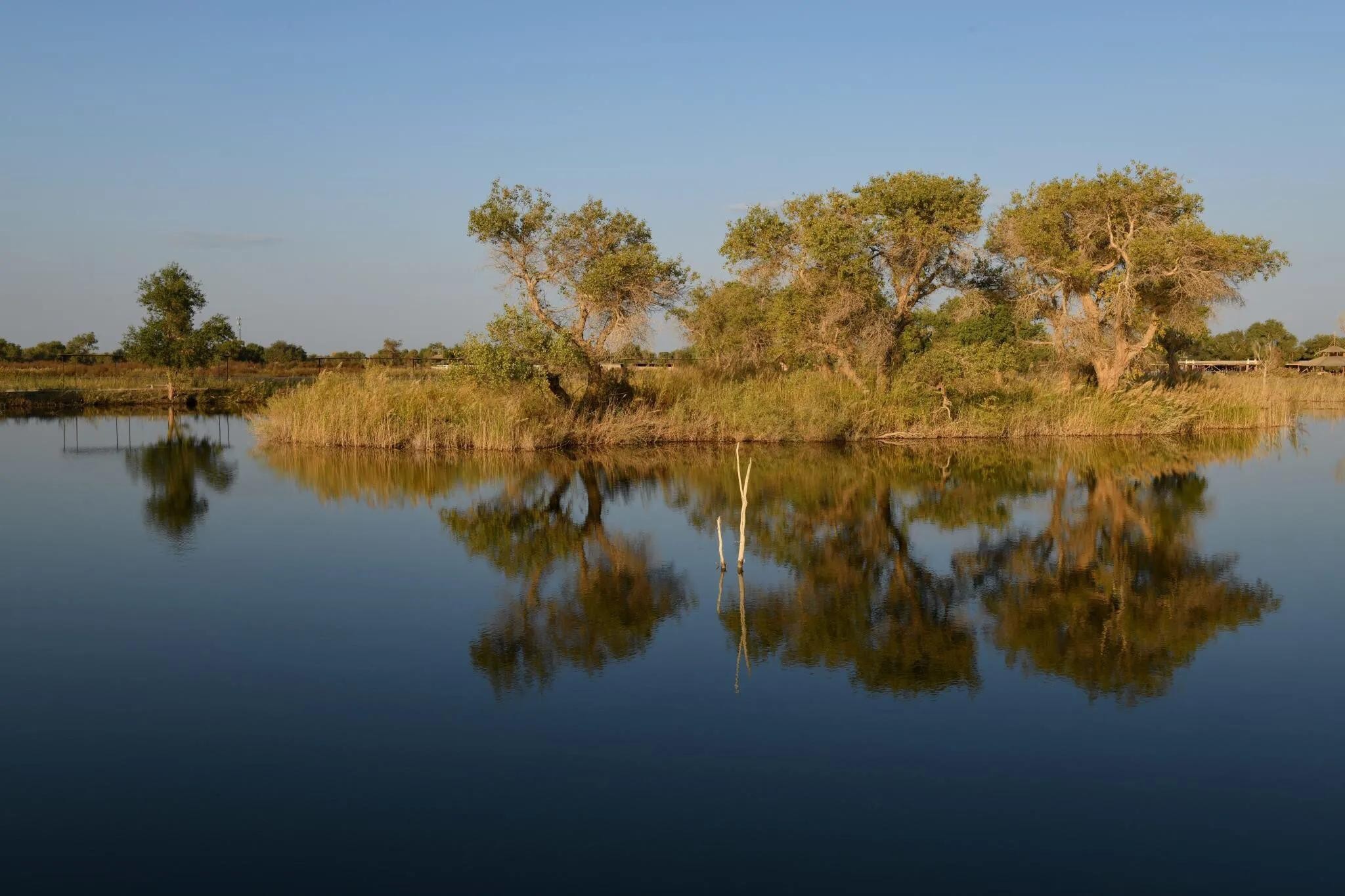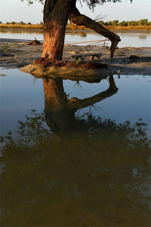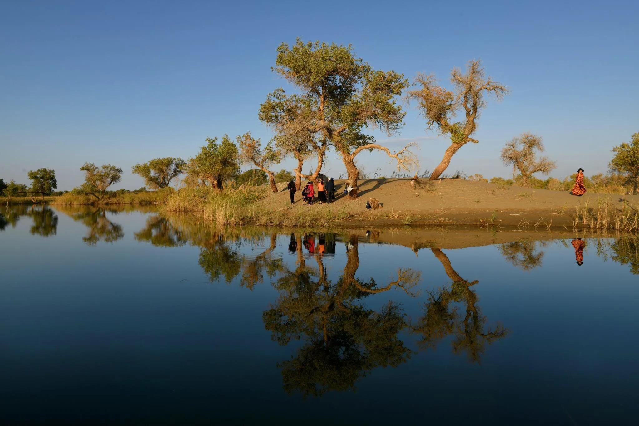 湖岸上、湿地中生长着若干千姿百态的胡杨树。且不仅仅是胡杨,还有沙漠、湖水、河流及浅滩,它们一起构成了罗布人村寨与众不多的胡杨林景观。