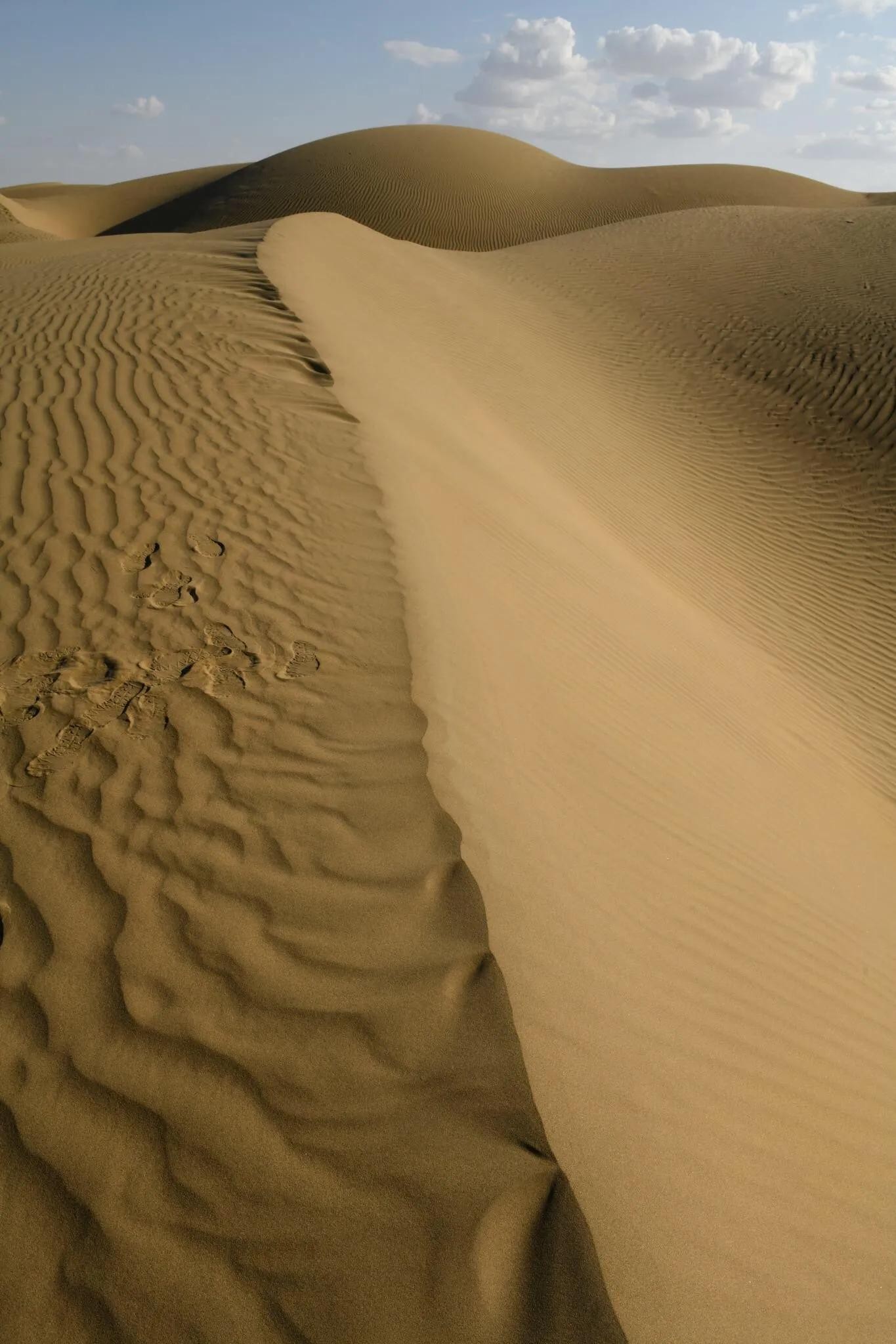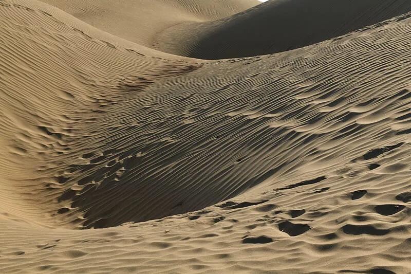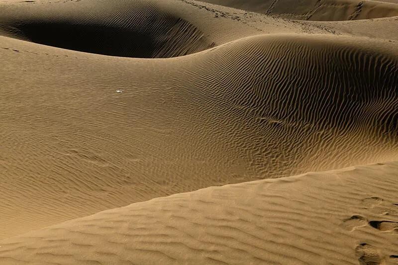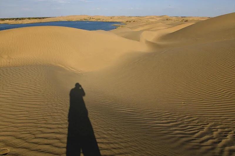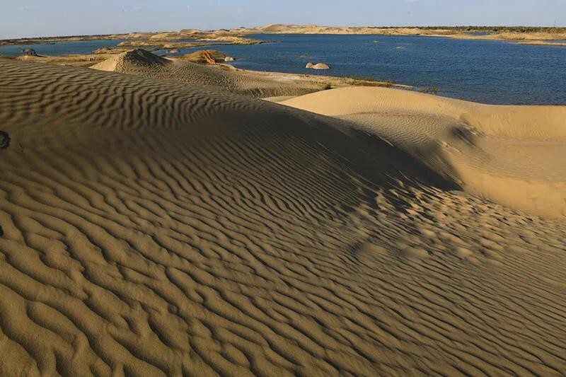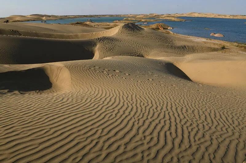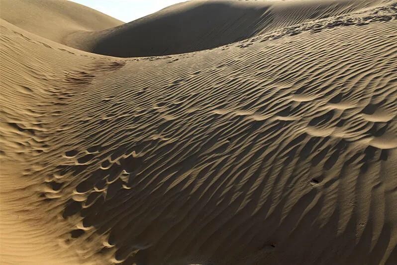 这是中国最大的沙漠——塔克拉玛干沙漠的南部边缘地带。沙粒极细,微风拂过,迅速画出一道道沙纹,一浪一浪的,像极了神女湖中的粼粼波光。