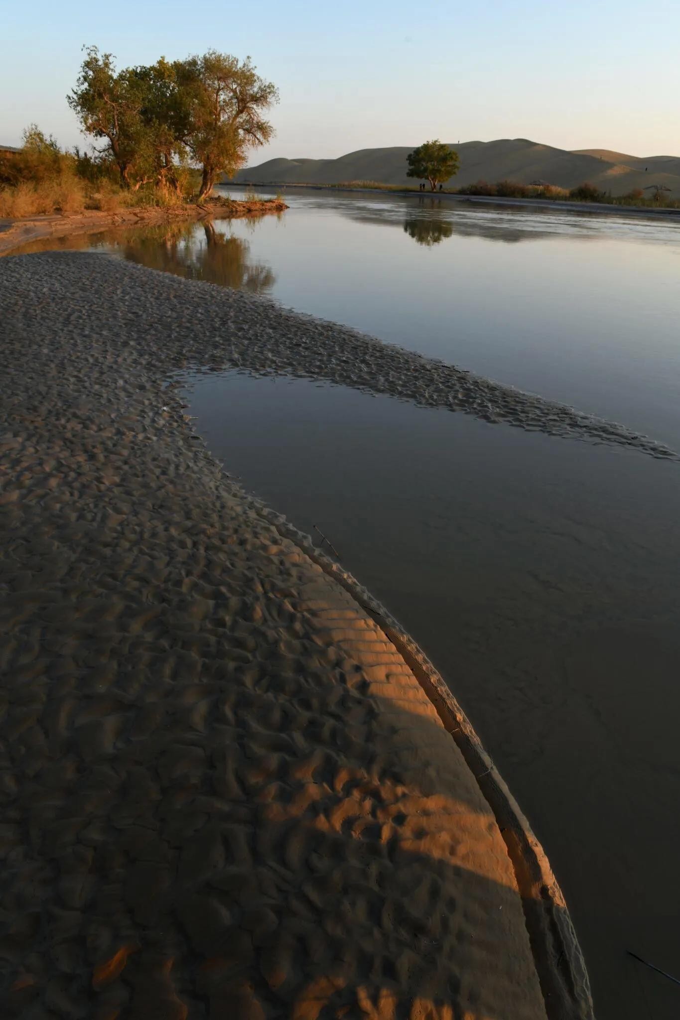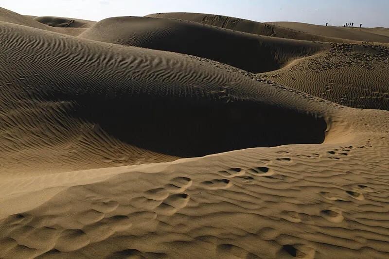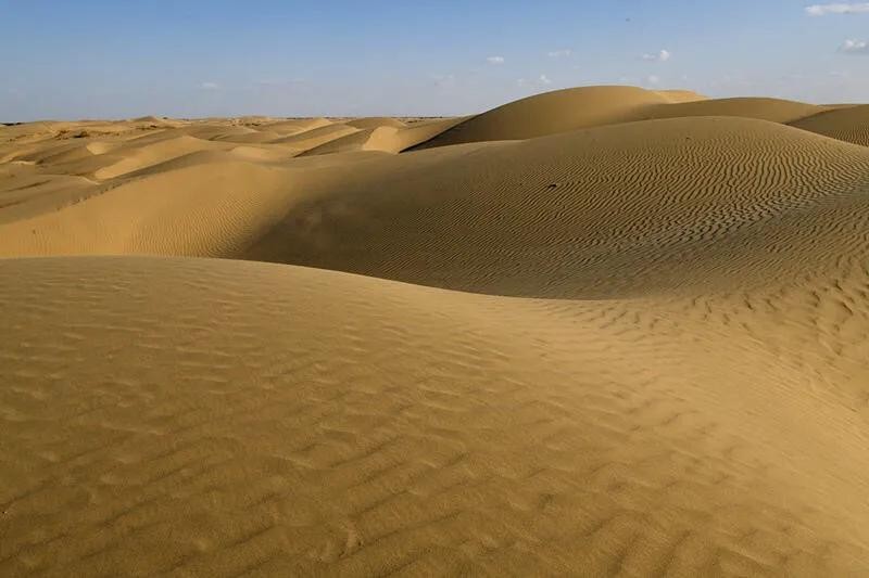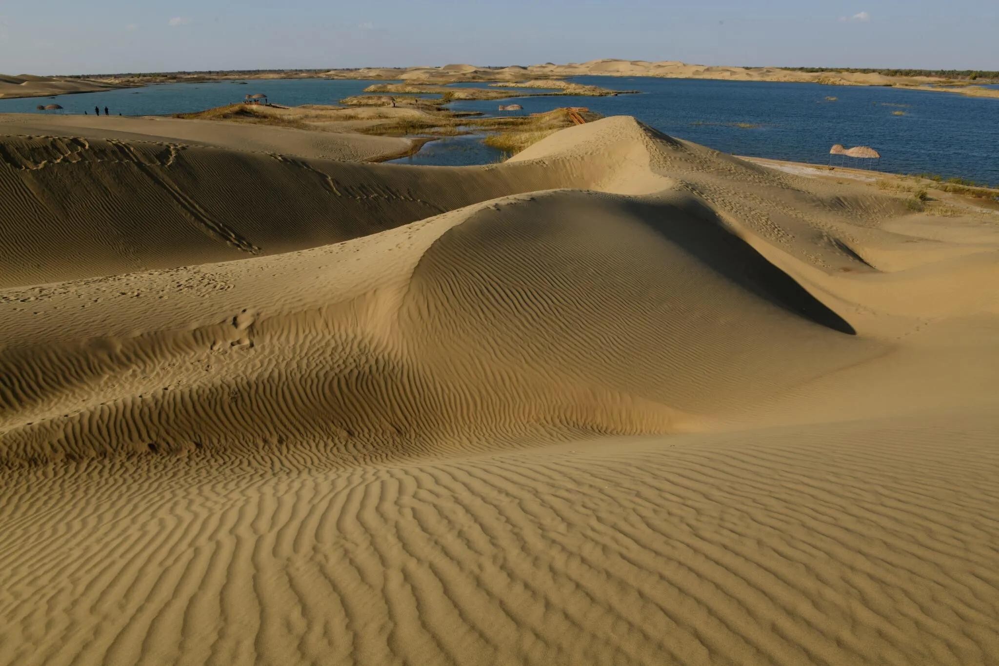 这是中国最大的沙漠——塔克拉玛干沙漠的南部边缘地带。沙粒极细,微风拂过,迅速画出一道道沙纹,一浪一浪的,像极了神女湖中的粼粼波光。