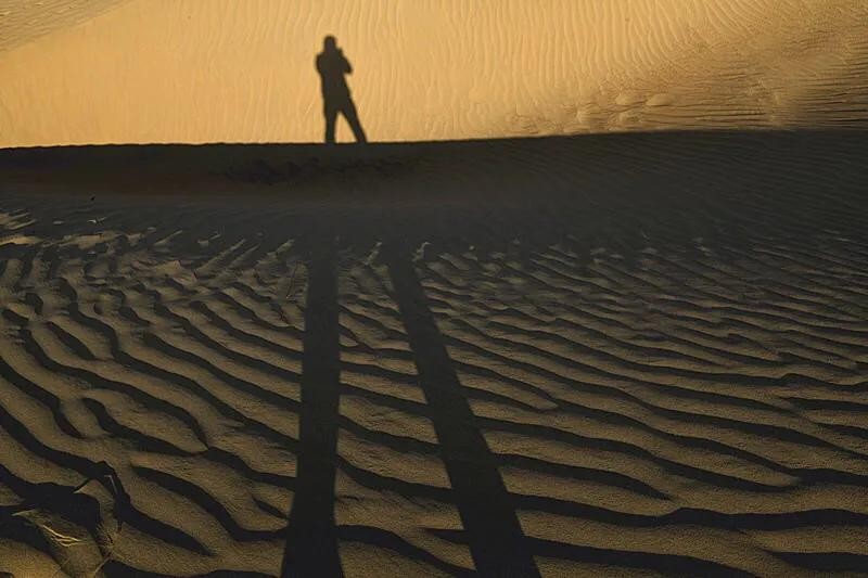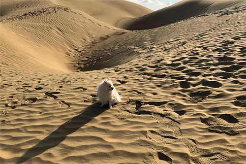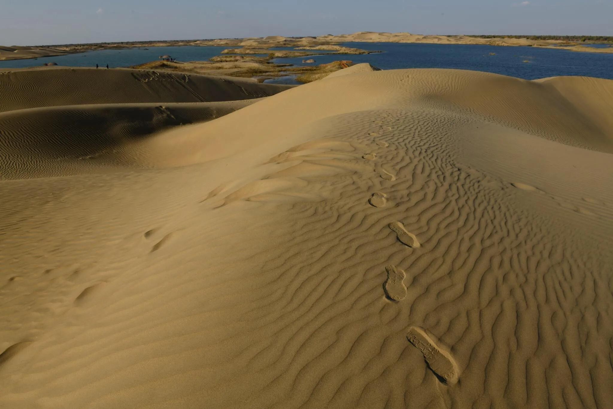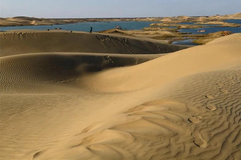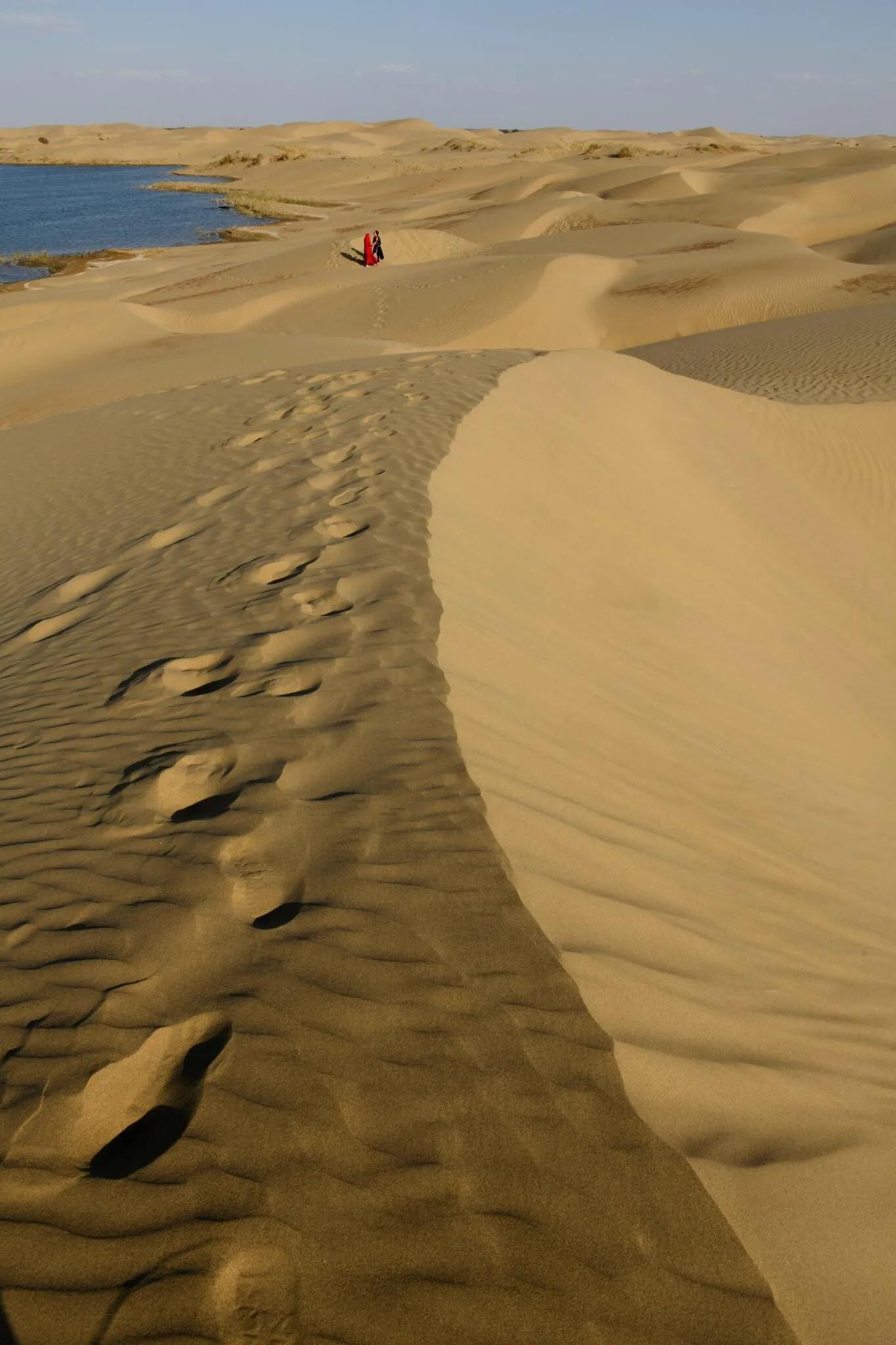 从沙漠里轻轻走过,转过身去,刚来的地方已是一排深深浅浅的脚印,脚印悠悠缓缓地延伸到蓝色的湖边或消失在另一座沙山的背面,竟然如此之美。