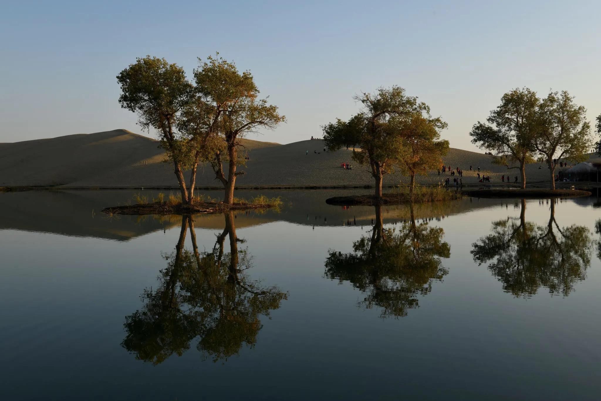 从高处看湖,看不到水的进出口,周围又皆是沙漠,这些水是从哪里来的呢?都是从沙地里冒出来的吗?真是有些奇妙!