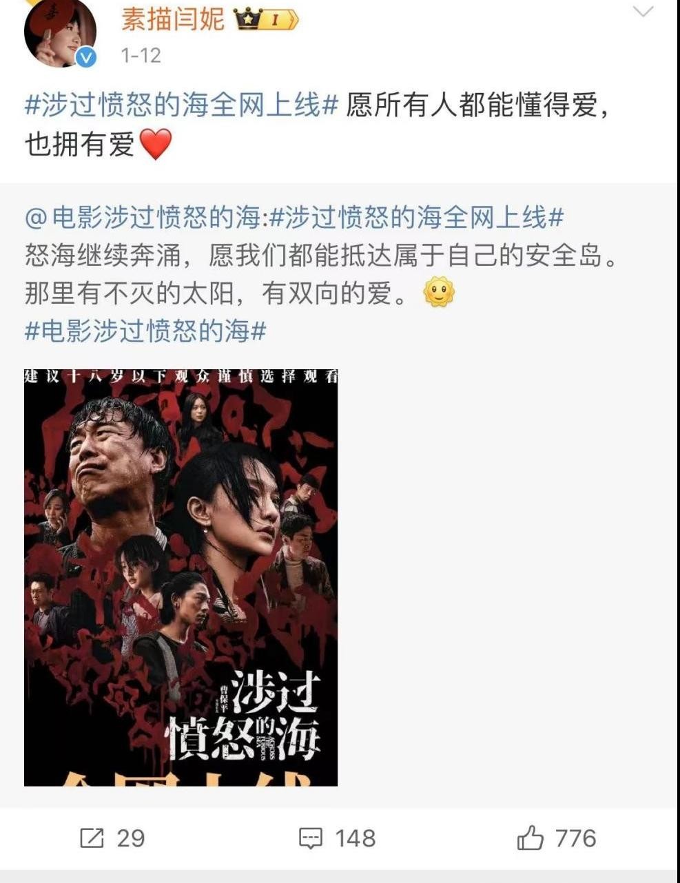 让许多网友期待的是,闫妮在2020年就与曹保平导演合作了《涉过愤怒的海》,在2023年11月才上映,1月12日闫妮还转发了全网上线的宣传微博。