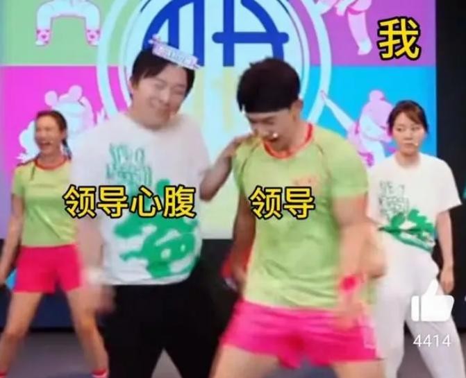 前面是刘畊宏带着黄渤跳的卖力,后面对比鲜明的是,闫妮仿佛喝醉了般,动作跟不上直接摆烂,一旁刘畊宏的老婆被逗笑的合不拢嘴。