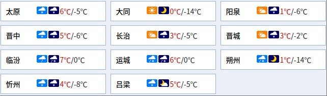 全省多云转阴天,北部局部和中南部大部分地区有小雪或雨夹雪,吕梁、临汾等地的局部地区有中雪。