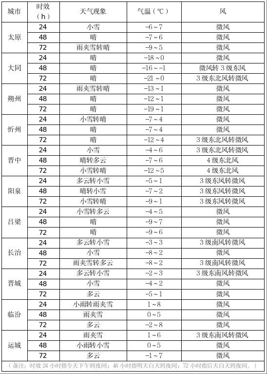 北中部多云,南部阴天转多云,中部局部和南部大部分地区有小雪或雨夹雪,南部局部地区有中雪,运城局部地区有小雨。