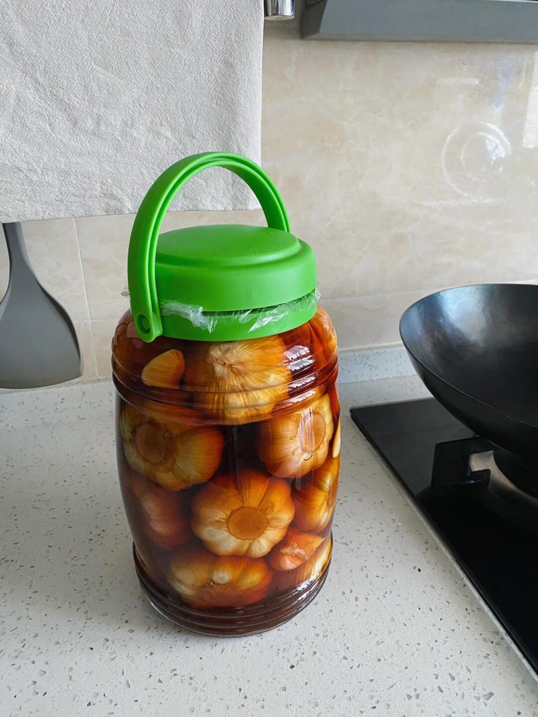 玻璃罐用白酒涮一遍杀菌。蒜头梗朝下码放,倒糖醋汁没过蒜头。最后浇勺高度白酒封口,这样腌半年都不起白沫。