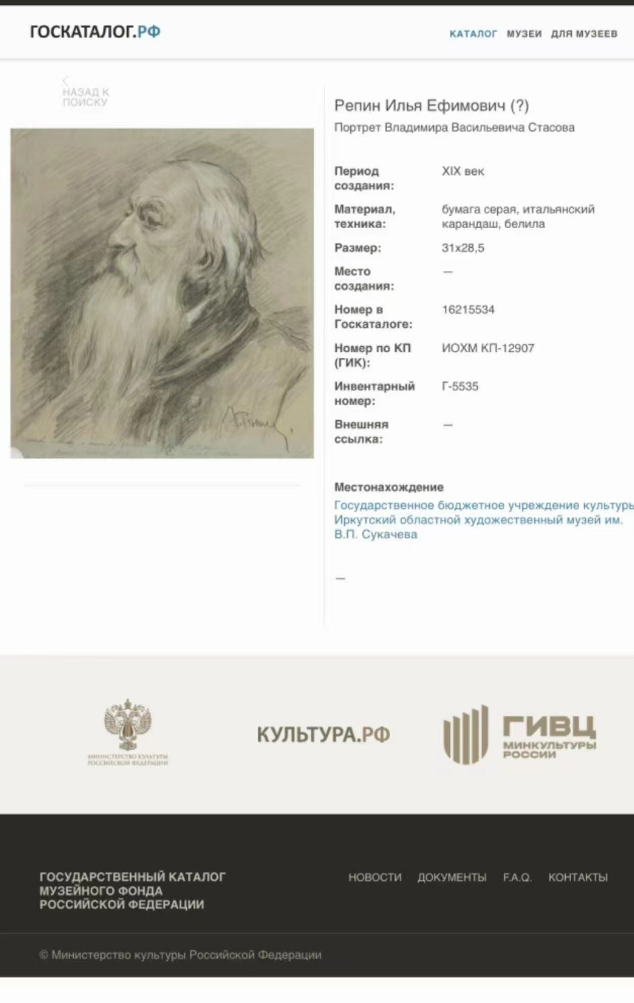 为了证实这幅作品到底是列宾的亲笔画作还是临摹品。全先生把照片发到俄罗斯寻求俄罗斯博物馆专家作出判断意见。俄博给的回复是:1、作品所画的确实是斯塔索夫。2、列宾曾画过斯塔索夫素描肖像,作品收藏在俄罗斯伊尔库斯克地区艺术博物馆。3、列宾作品都有作者签名。所有材料都不能确定在法国这幅素描是列宾所作。回音几乎是否定的。