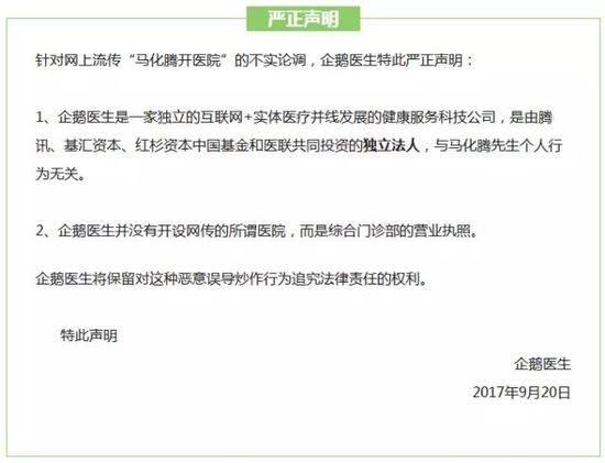 这两天,你是不是也被以“马化腾开医院”为标题的文章刷屏了?针对网上流传的这一论调,企鹅医生20日发出严正声明,称公司并没有开设网传的所谓医院,而是综合门诊部的营业执照,且此事与马化腾个人行为无关。公司还将保留对这种恶意误导炒作行为追究法律责任的权利。