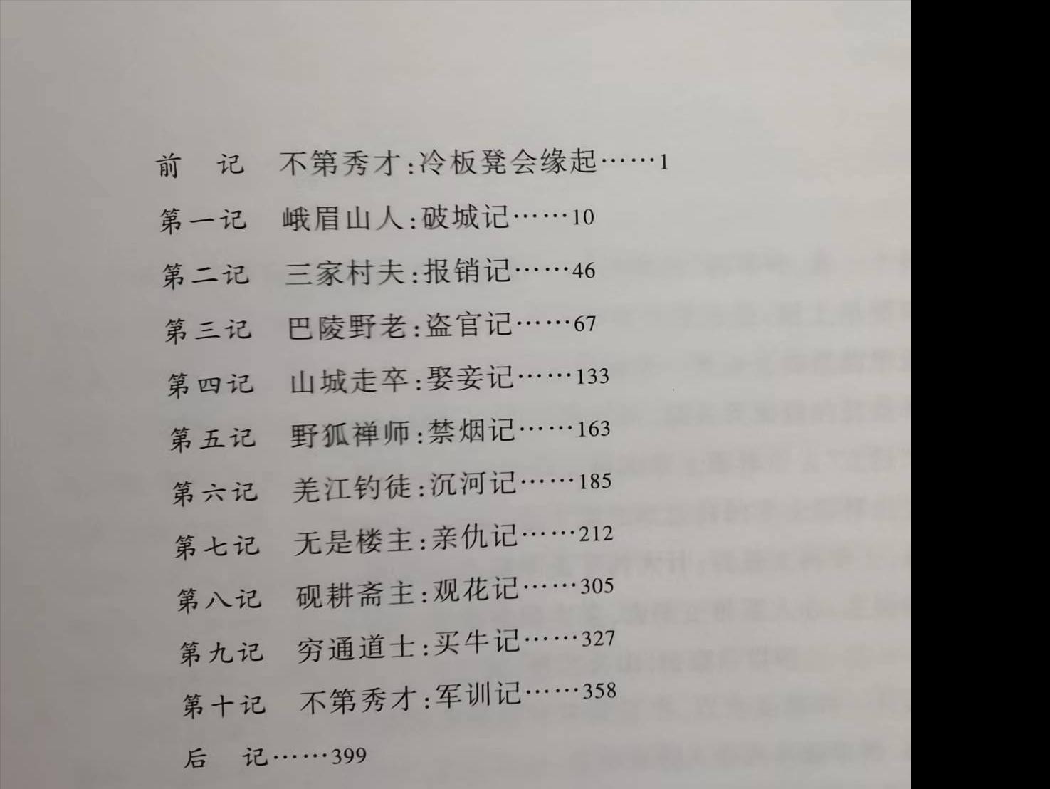 《夜谭十记》分别是《破城记》《报销记》《盗官记》《娶妾记》《禁烟记》《沉河记》《亲仇记》《观花记》《买牛记》《军训记》,马识途先生与他的几位同事晚上没得事情就集结在一起,成立“冷板凳会”轮流讲故事,个个故事引人入胜,好听至极。