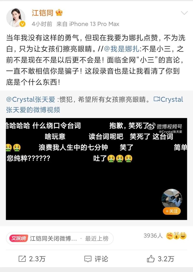 不明真相的网友一开始以为娜扎是知三当三,纷纷跑到她的社交平台下口诛笔伐,用尽侮辱之词。
