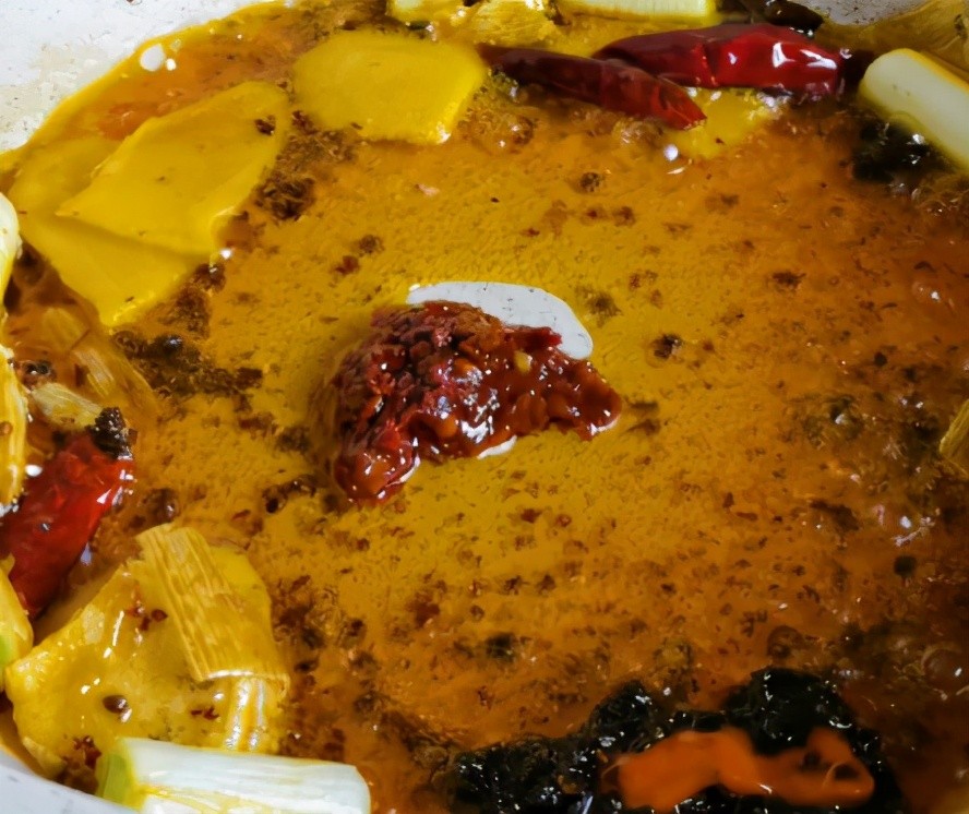 3.锅中加入油,加入葱姜八角煸炒出香味,然后在加入牛油火锅底料一小块和豆瓣酱炒出红油