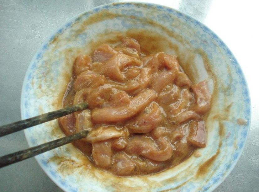 切好后装入盆中,加适量的食盐,少许鸡粉,少许胡椒粉,少许十三香增香,搅拌均匀后加入适量的料酒去腥,再打入一个鸡蛋清,蛋清遇热迅速凝固,能锁住肉的水分,让肉质保持鲜香嫩滑,再加入少许老抽调色,用筷子顺着一个方向搅拌,搅拌均匀后加入一勺玉米淀粉,再加入少许清水,让面粉均匀裹在肉条表面,这样炸出来的肉更香酥,最后加入少许植物油,搅拌均匀,腌制20分钟,让它入味。植物油的作用一是起酥,二是防止沾粘。