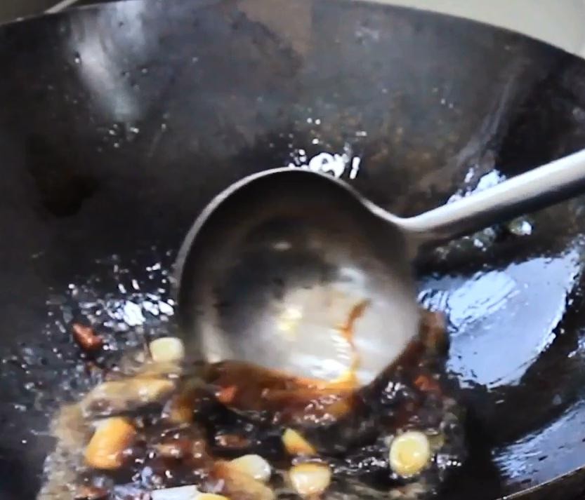 第三步:热锅烧油,油热后把葱蒜放入爆香,葱蒜爆香后加入干红辣椒段,2个八角,一小把花椒籽,炒出香味,然后加入适量的清水,加少许老抽调色,加入少许蚝油提鲜,加入适量的食盐,少许胡椒粉,少许鸡粉,少许十三香增香,