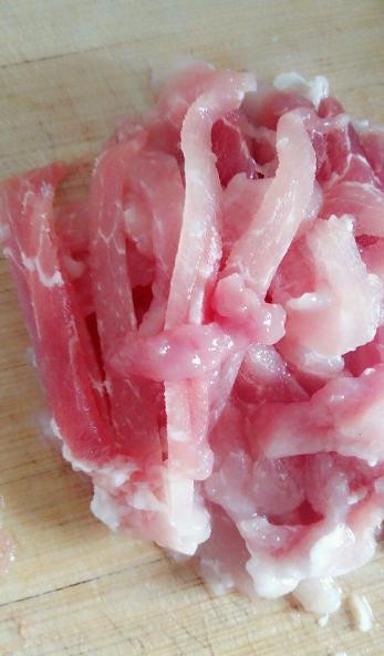 第一步:准备一块土猪肉,清洗干净,先切厚片,再切成粗条。就我个人而言,全瘦肉还没有带肥肉的好吃。