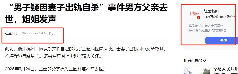 红星新闻:《“男子疑因妻子出轨自杀”事件男方父亲去世,姐姐发声》-2025-5-22