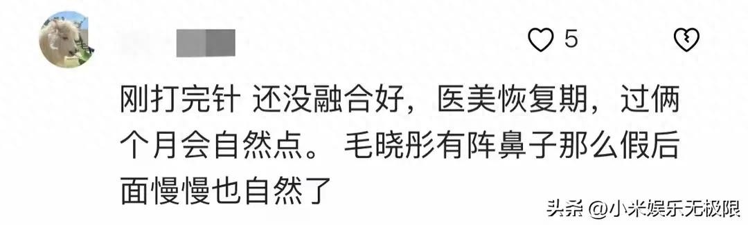 不过也有一些网友比较理性,猜测她可能是处于医美恢复期,刚打完针,还没融合,后面应该会自然一些。