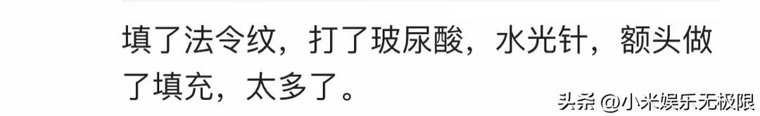 但更多的网友开始猜测她到底做了哪些医美项目,有人说她做了眼袋,还切了松皮,所以没有卧蚕;也有人觉得她填了法令纹,打了玻尿酸、水光针,额头也做了填充。