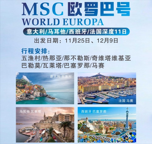 MSC地中海邮轮【欧罗巴号】:从意大利开始,途经马耳他、西班牙、法国、瑞士,14天漫游西地中海+瑞士。