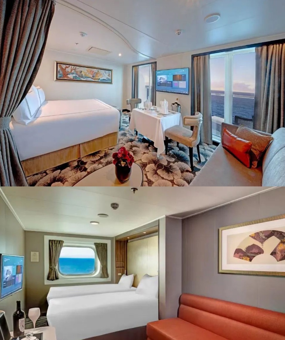 邮轮上有多种房型供游客选择,包括内舱房、海景房、阳台房和套房等。那么什么房型建议选,那么不建议呢?星航浪浪来讲一讲。