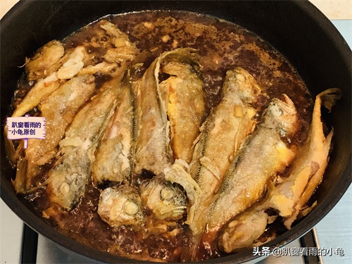 步骤4. 料汁煮开后,将煎好的小黄鱼码入锅中,中小火慢烧。