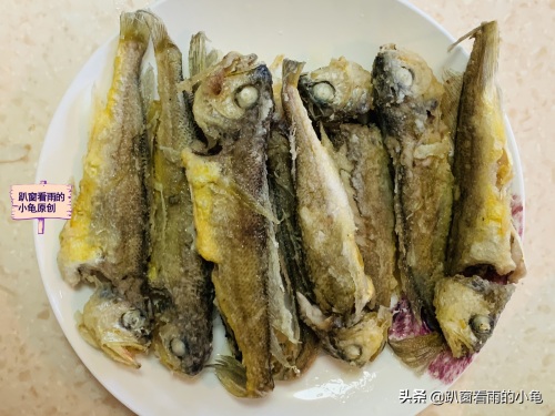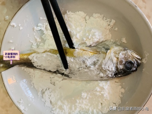 2:锅中的油比炒菜略多、油炸略少些,小黄鱼淀粉不用裹太多,薄薄一层即可。