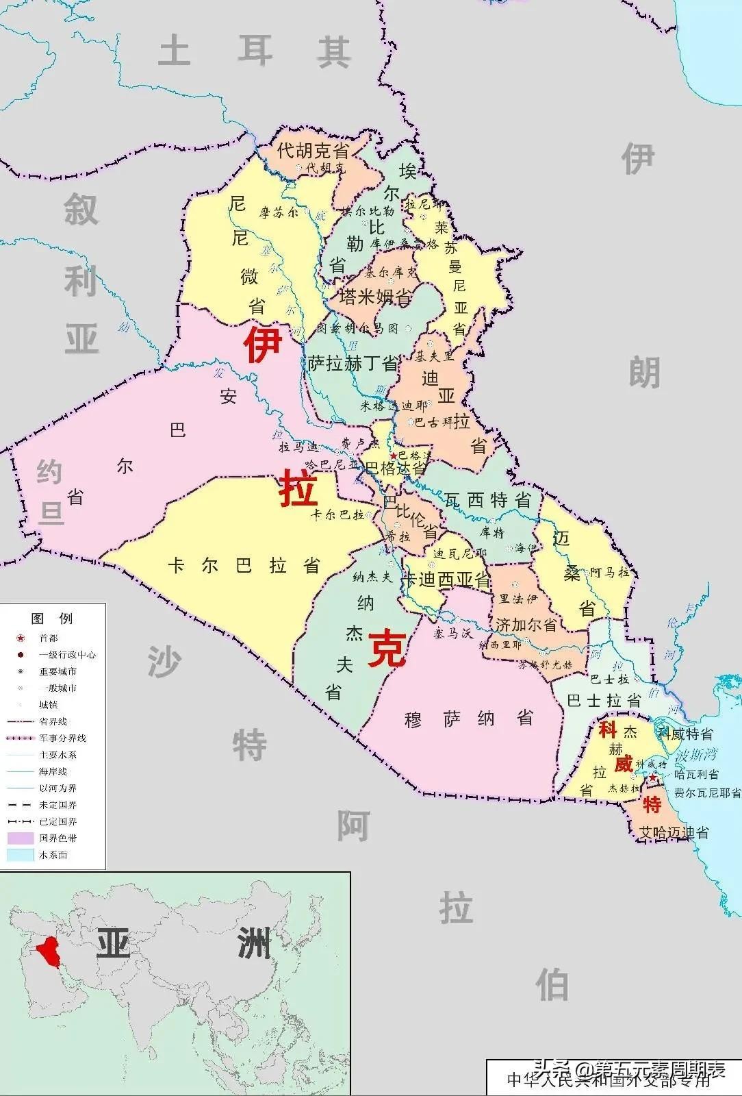 伊拉克共和国(阿拉伯语:الجمهوريةالعراقية,库尔德语:كۆماریعێراق,英语:The Republic of Iraq),简称“伊拉克”,位于亚洲西南部,阿拉伯半岛东北部,南方是沙特阿拉伯、科威特,北方是土耳其,西北是叙利亚,伊朗和约旦各位于其东西两侧。