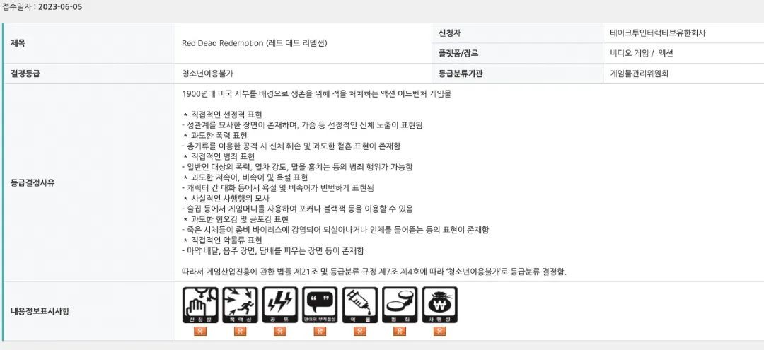 据外媒Gematsu报道,《荒野大镖客:救赎》于本月15日在韩国通过评级。新的评级分类编号为“CC-NV-230615-001”,其中“NV”指的是主机游戏,“NP”指的是PC游戏。