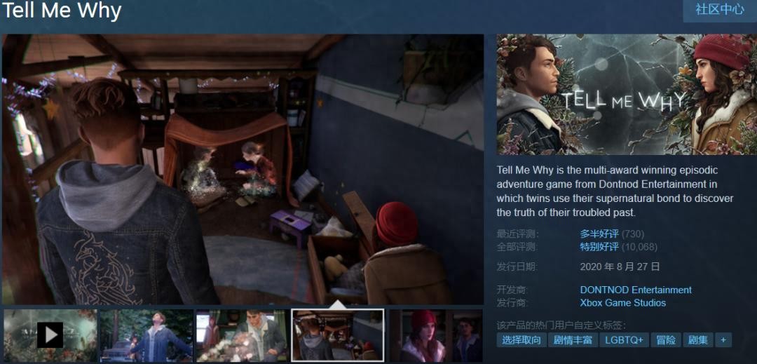 Steam限制喜加一剧情冒险游戏《Tell Me Why》(谓何),免费领取截止至7月2日。不过该游戏于2020年8月27日发售后没几天就锁了国区,原因未知,至今仍未解锁。所以喜加一有限制,需使用其他地区的Steam账号领取。