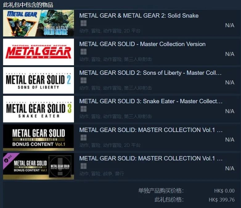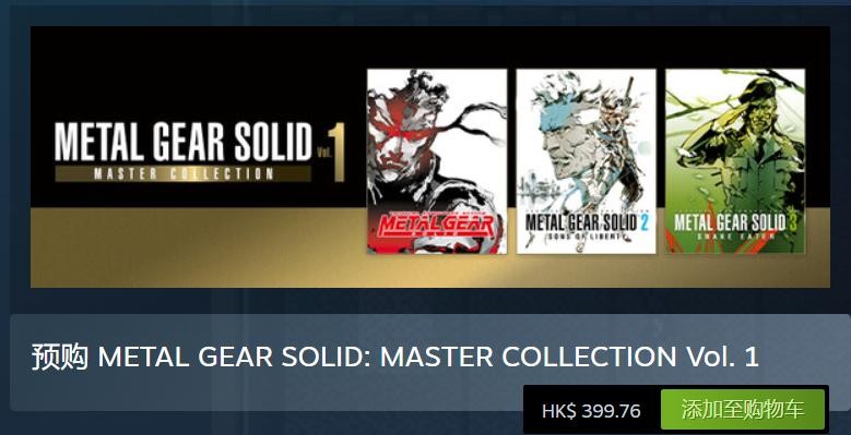 科乐美《合金装备:大师合集 第一集》今天正式上架了Steam平台,目前该游戏分为三个版本,分别在不同地区售卖,不过三个版本都锁国区。而港区可购买的版本定价为399.76港元。