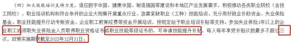 参加失业保险1年以上的企业职工或领取失业保险金人员取得职业资格证书或职业技能等级证书的,可申请技能提升补贴,每人每年享受补贴次数最多不超过三次,政策实施期限截至2023年12月31日。