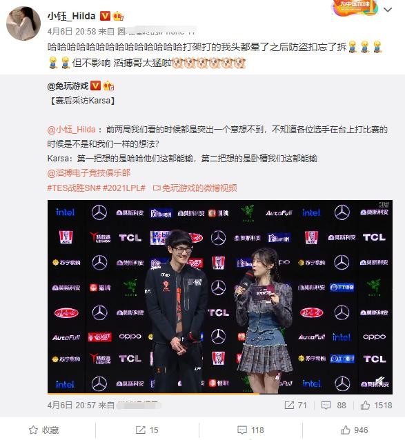 而就在滔博战胜SN之后的采访阶段,发生了一件很有趣的事。小钰作为当天采访席上的女主持人,按照惯例要去采访获胜队伍滔搏的队员。当时受邀采访的队员是Karsa,整个采访过程持续了四分钟之久。
