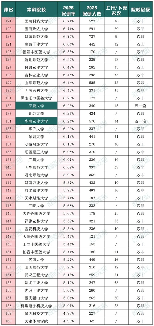 7. 双一流高校中宁夏大学和华南农业大学保研率比较低;