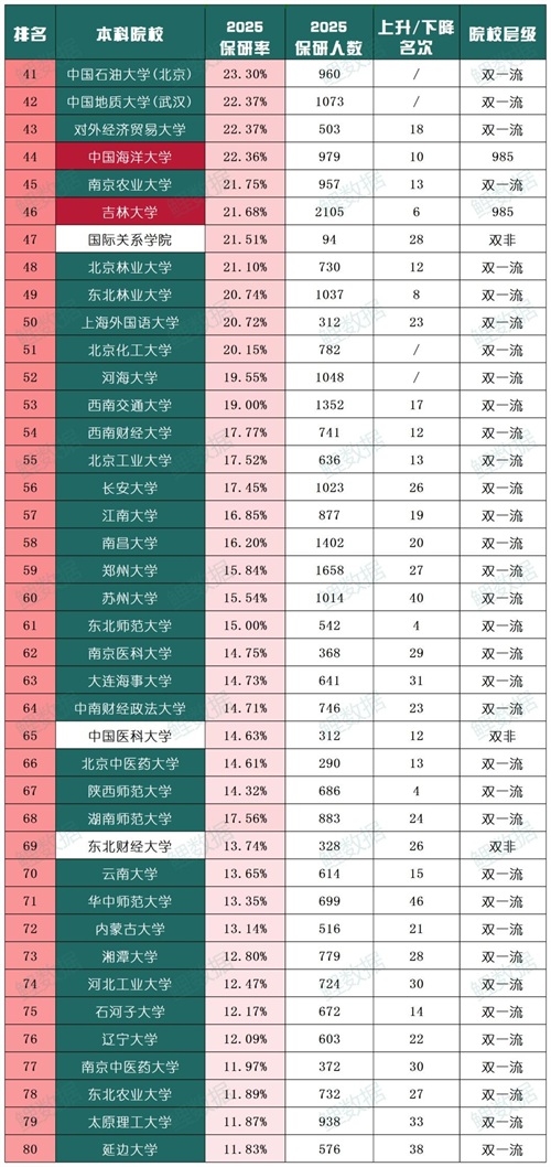 4. 从表中的数据看吉林大学和中国海洋大学这两所985的保研率偏低,当然网友并没有收集到:国防科技大学、兰州大学和中央民族大学的保研数据;