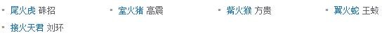 火部五位正神:尾火虎(朱招);室火猪(高震);觜火猴(方贵);翼火蛇(王蛟);接火天君(刘环)。