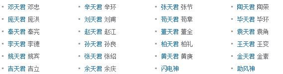 闻仲:殷商太师,商纣王之父帝乙托孤之臣,对殷商忠心耿耿。兵伐西岐中亡于绝龙岭。后封神为“九天应元雷神普化天尊”,督率雷部二十四正神,兴云布雨,万物托以长养,诛逆除奸,善恶由之祸福。