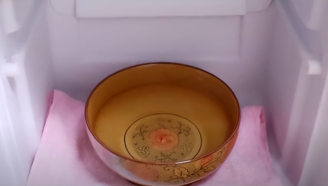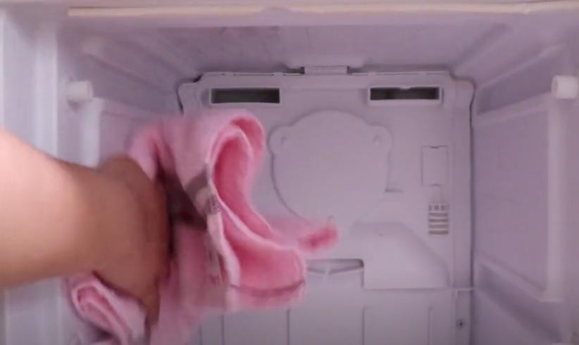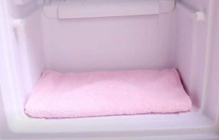 冰箱里面我们先在底部给她垫上一条毛巾,毛巾给他垫在底部,
