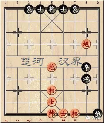 如上图所示,红方走炮二平五即可形成中线重炮绝杀,小朋友切不可走炮二退三吃炮错失胜利。