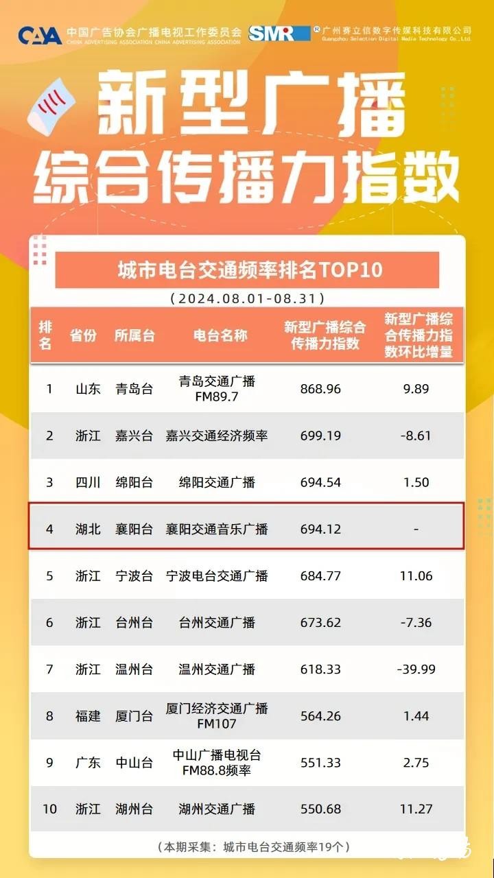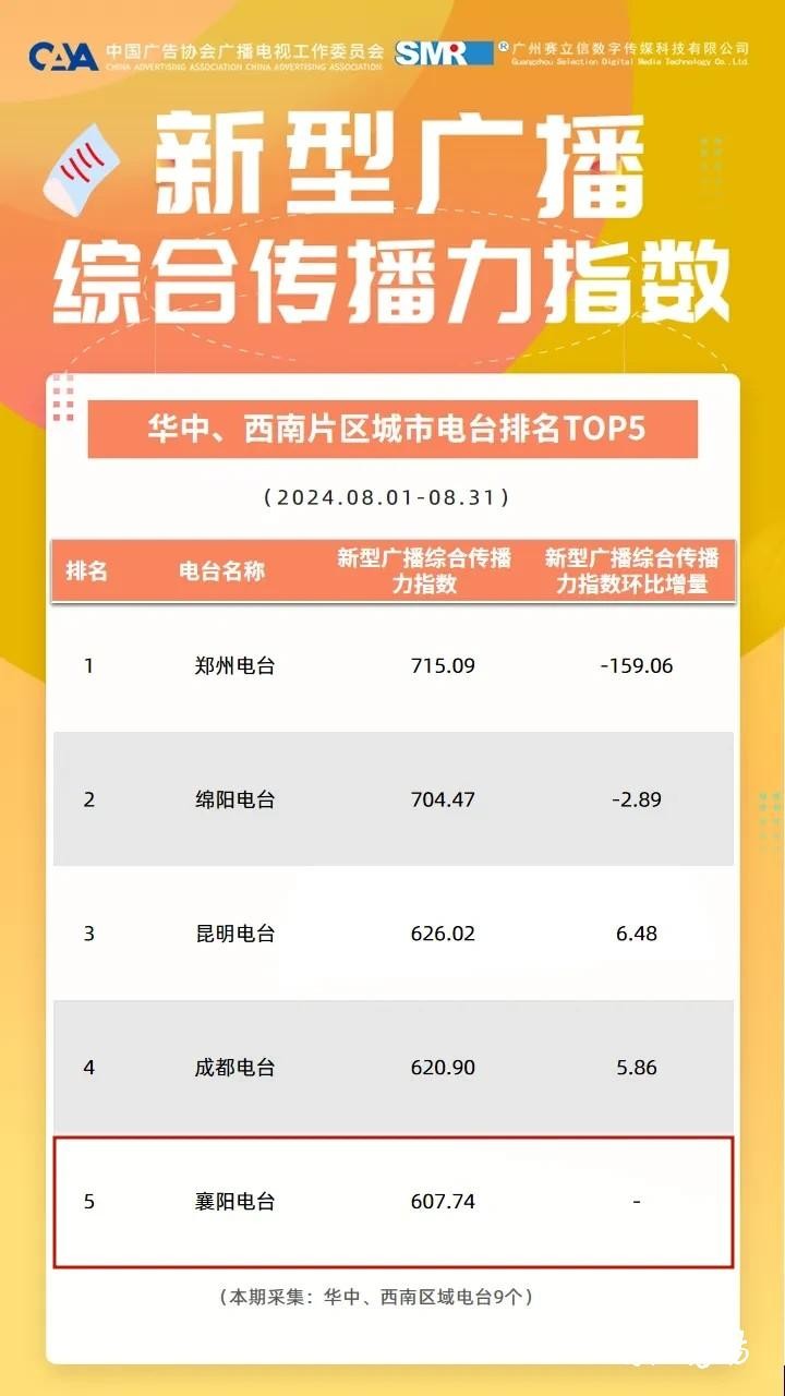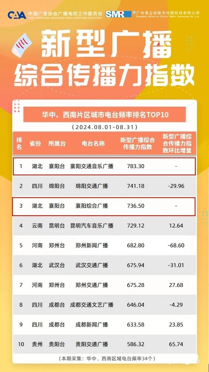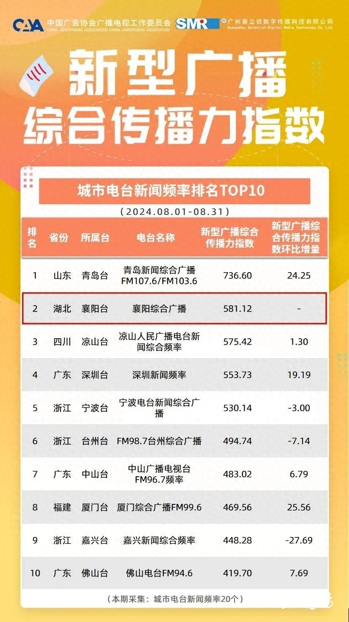 近日,中国广告协会广播电视工作委员会与赛立信媒介研究有限公司权威发布了2024年8月赛立信新型广播综合传播力指数排名,襄阳融媒体中心两套频率进入全国城市电台传播力指数前三名。