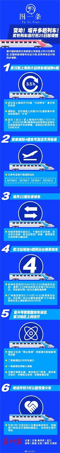 生活服务【6月25日起,武汉到上海最快只要三个半小时】6月25日零时起,全国铁路调整列车运行图,武铁列车运行图同步调整。届时,乘动车到上海更舒适快捷,武咸城际动车可直达天河机场,部分高铁在武汉站实现同站台换乘。武汉至上海间开行6趟“大站快车”复兴号动车组。调图后,京沪高铁上时速350公里的复兴号动车组再次“扩容”,高铁成网运行优势更加凸显。如武汉(汉口)至上海间开行的G1722/19次、G598/9次等6趟高铁动车组列车安排在沿途省级城市车站停靠,全程运行时间均为3小时30分。增开22趟长途动车,进一步提升客流高峰输送能力,包括济南西往返汉口,十堰东至北京西,武汉至北京西,驻马店西至广州南,漯河西至北京西等20趟动车。为方便周边城市旅客直达天河机场,武咸城际、武孝城际动车跨线开行,开辟空铁联运新通道。新增开武咸城际跨武孝城际运行的列车4趟,旅客搭乘从云梦东至咸宁南的D5798/5 、D5796/7、D5794/1、 D5792/3次城际动车,均可直达天河机场。