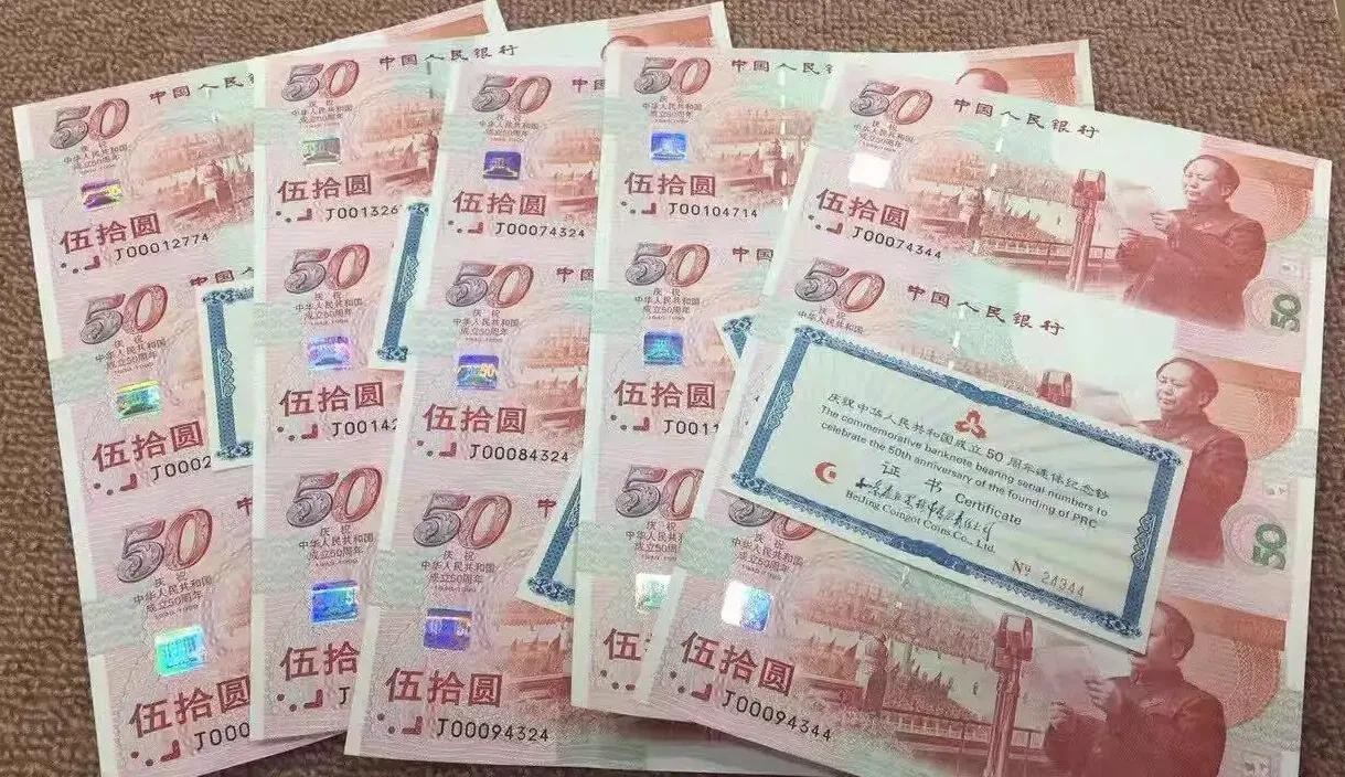 为了庆祝中华人民共和国成立50周年,中国人民银行于1999年9月20日发行了一张面值为50元的纪念钞,这也是新中国历史上第一张纪念钞,发行量为6000万张,与人民币等值流通,纪念钞规格160x 80 mm,采用了大量先进技术的综合运用。