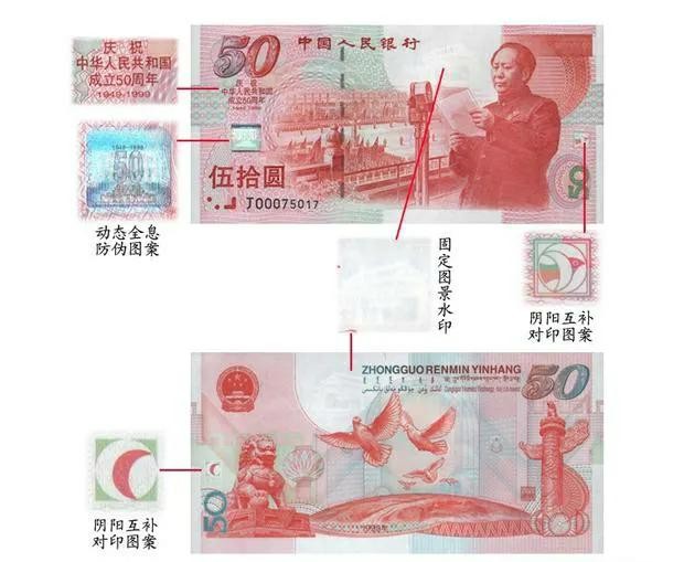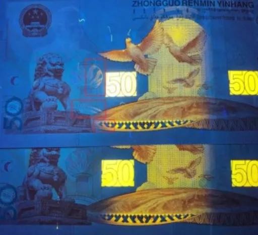 五十周年纪念钞首次釆用开窗安全线技术,以及多项防伪技术,具备12项全息防伪,安全性极高。