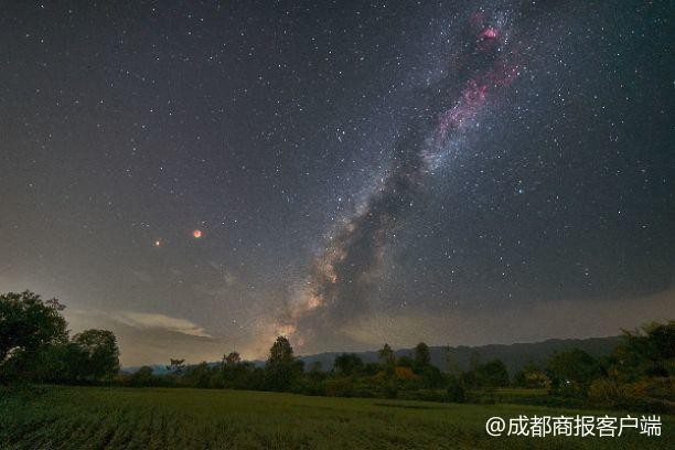 乡村夏夜中的红月、火星和银河,四川省天文科普学会常捷摄于重庆市长寿区