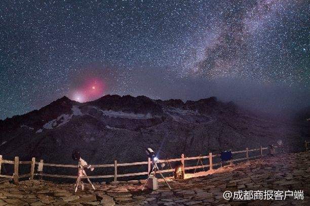 古老冰川上的红月、火星和银河,四川省天文科普学会曾阳摄于达古冰山景区观景台