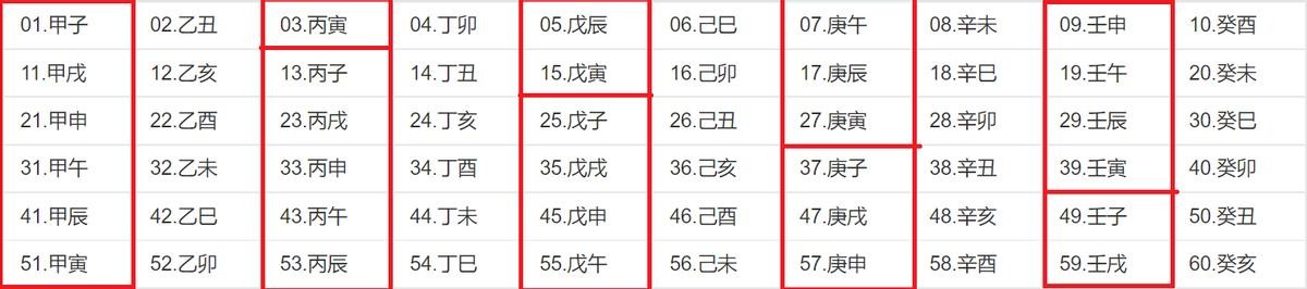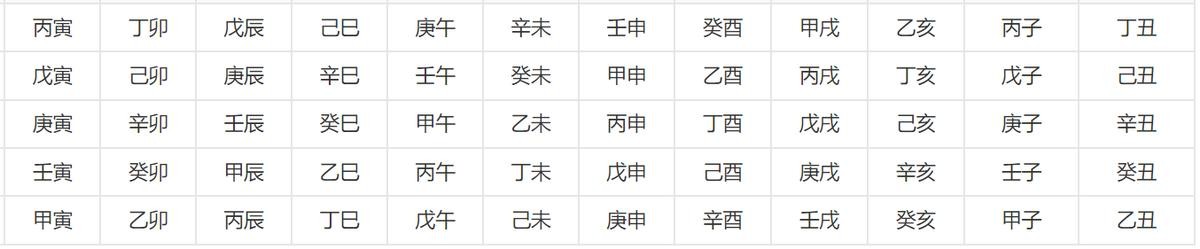 答案是对应表格,五年一轮回,从甲开头的年份到戊开头的年份5年轮回一次,然后从己开头的年份到癸开头的年份5年再一轮回(见下表)。