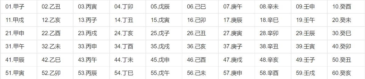 干支的排列并不是,一方固定另一方变化,比如甲子、甲丑、甲寅、甲卯........或者乙子、丙子,丁子......而是双方同时按照顺序变化,甲子、乙丑、丙寅......