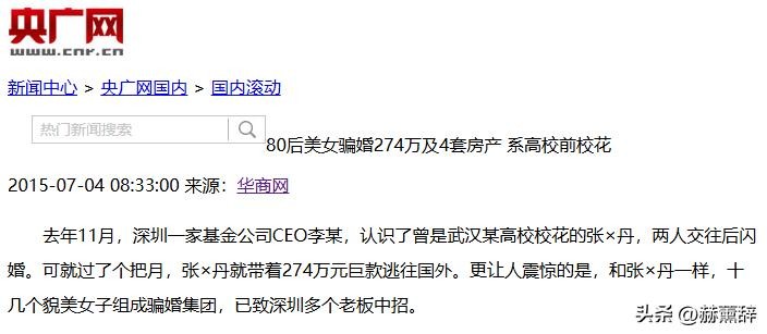 央广网,80后美女骗婚274万及4套房产 系高校前校花,2015年7月4日