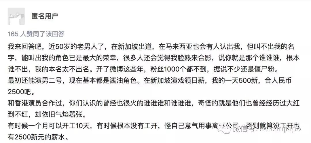 在知乎上,有艺人匿名回答问题表示,拍戏的时候日薪为500新币每天,一个月可以开工10天。